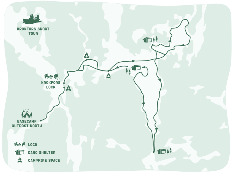 Voor wie op zoek is naar een kort, maar onvergetelijk avontuur is de korte route naar Krokfors een ideale optie. Deze route is perfect voor een lang weekend en biedt een snelle onderdompeling in de Zweedse natuur zonder dat je eerdere kano-ervaring nodig hebt. Vaar door rustige wateren, ontdek kleine eilandjes waar je even kunt pauzeren en geniet van de mogelijkheid om te vissen in visrijke gebieden. Omdat je geen land hoeft over te steken, richt deze route zich alleen op het plezier van peddelen in een serene, ongerepte omgeving.